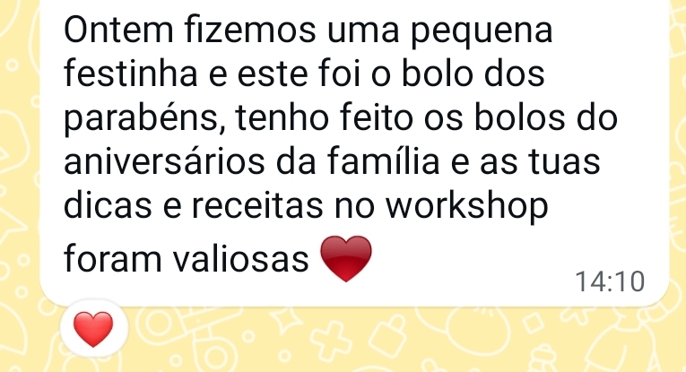 Imagina os olhos de quem mais amas a brilhar ao verem um bolo de aniversário que tu próprio(a) fizeste. Não é só um bolo: é uma memória, um momento de celebração e um gesto de carinho que vai ficar para sempre! Nos meus workshops online, mostro-te passo a passo como transformar ideias em bolos incríveis, mesmo sem experiência prévia, sem técnicas complexas nem ingredientes estranhos!